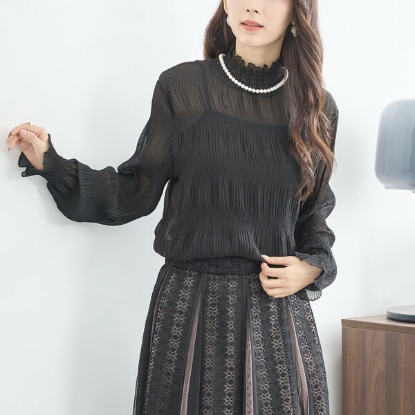 表情のあるシャーリングシフォンが上品なブラウスです。首元のギャザーを寄せたミニフリルがアクセント。ゆとりがありながらも衿ぐりと袖口がきゅっと締まっているため、ドレッシーな雰囲気でも着用いただけます