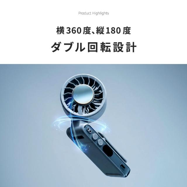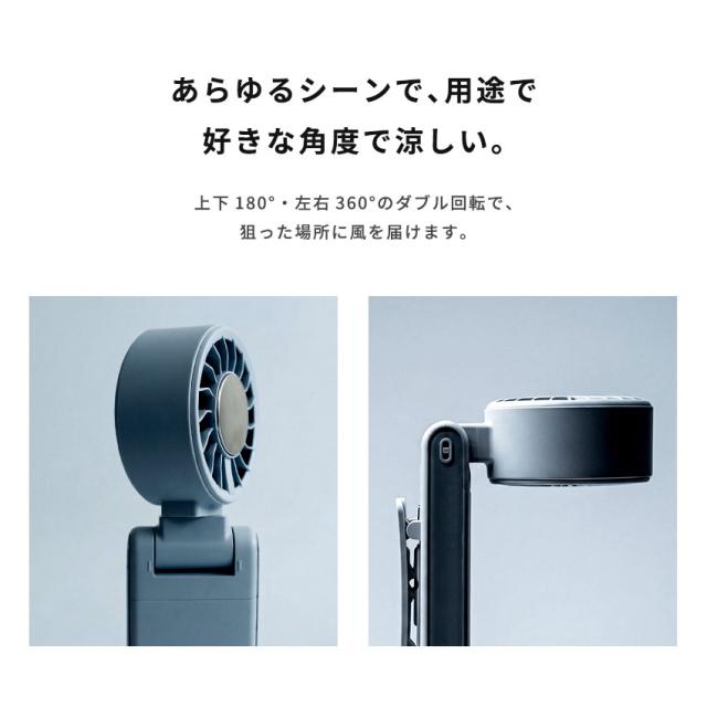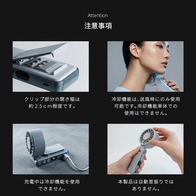 | 【多彩な機能を搭載】 冷却+ハンディ+クリップ+スタンド+首掛け。多機能な5WAYファン。 【横360度、縦180度ダブル回転設計】 上下180°・左右360°のダブル回転で、狙った場所に風を届けます。あらゆるシーンで、用途で。好きな角度で涼しい。 ※本製品は自動首振りではありません。 【体感温度を下げる、風+冷却プレート】 TEC冷却×パワー送風で、熱い風を送るだけになりがちなハンディファンの弱点を克服。 ※冷却機能は、送風時にのみ使用可能です。冷却機能単体での使用はできません。 ※充電中は冷却機能を使用できません。 【取付自由クリップ。これ1台で、どこでも】 日傘・衣服・カバン・ベルトなどに取り付けて。シーンに合わせて自由に使えます。グリップ部分にはシリコン製パーツを搭載。しっかりと固定し、傷をつけません。 ※傘などに取り付ける際は、クリップの凹みにしっかり固定してください。 ※クリップ部分の開き幅は約2.5cm程度です。 【屋外強風クラスのパワー最大7.7m/s】 小型なのにここまで涼しい。回転数7100rpmの力強さ。やさしいそよ風から、クールな暴風まで。レベル1から100までの繊細な調整が可能です。 ボタンの単押しor長押しで、2種類の風力調節が可能。ポチッと単押しで素早く5段階調整、じっくり長押しで段階にとらわれないシームレス調整を実現。 【便利なストラップ付属】 腕につけられ、長さ調整可能なストラップが付属。 ソフトで厚みがあり、快適な付け心地です。バッグにかける際にも便利。 ※ストラップをご使用の際は、付属のストラップ通しアシストパーツをご利用ください。 【最長4.8時間持続大容量3000mAhバッテリー】 次世代エネルギー統合バッテリー技術で長時間駆動。約3.8時間で充電完了、最長約4.8時間の連続使用を実現。 便利なUSB Type-Cケーブルでの充電に対応。 |