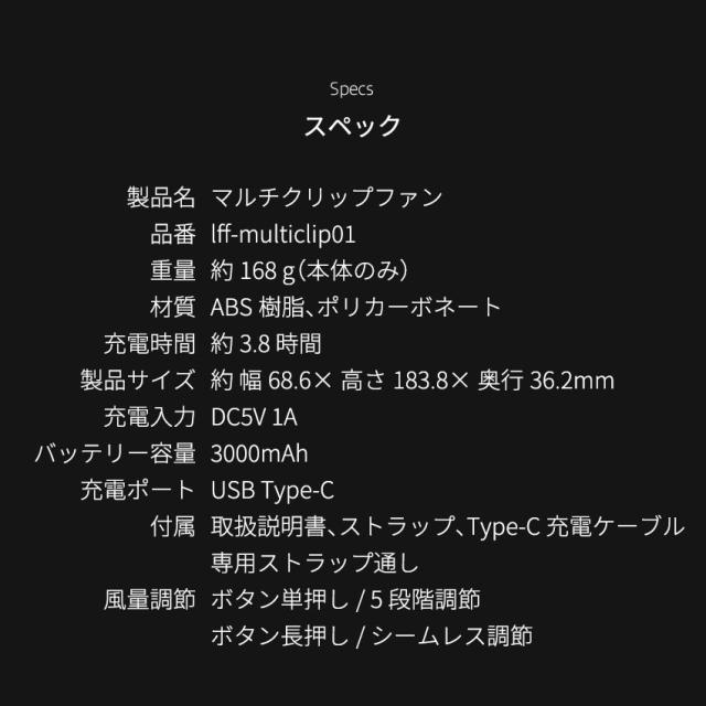 | 製品名:Lafuture マルチクリップファン 品番:lff-multiclip01 重量:約168 g(本体のみ) 充電時間:約3.8 時間 製品サイズ:約 幅68.6×高さ183.8×奥行36.2mm 充電入力:DC5V 1A バッテリー容量:3000mAh 充電ポート:USB Type-C 風量調節:ボタン単押し/ 5 段階調節、ボタン長押し/ シームレス調節 材質:ABS樹脂、ポリカーボネート 色:サンドベージュ・ミントブリーズ・フロストグレー 商品内容:本体・取扱説明書、ストラップ、Type-C 充電ケーブル、専用ストラップ通し |