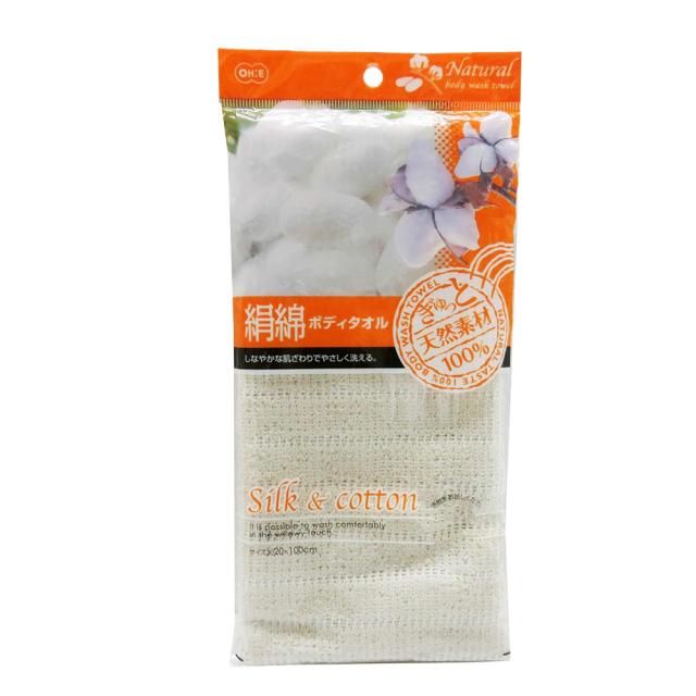 シルクと綿を使った、肌にやさしいボディタオル。