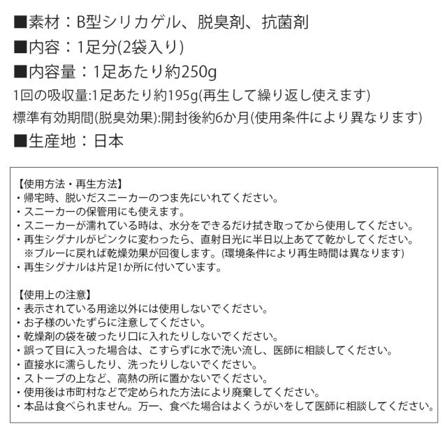雨や雪で濡れたスニーカー、汗などで湿ったスニーカーを素早く乾かす乾燥剤。