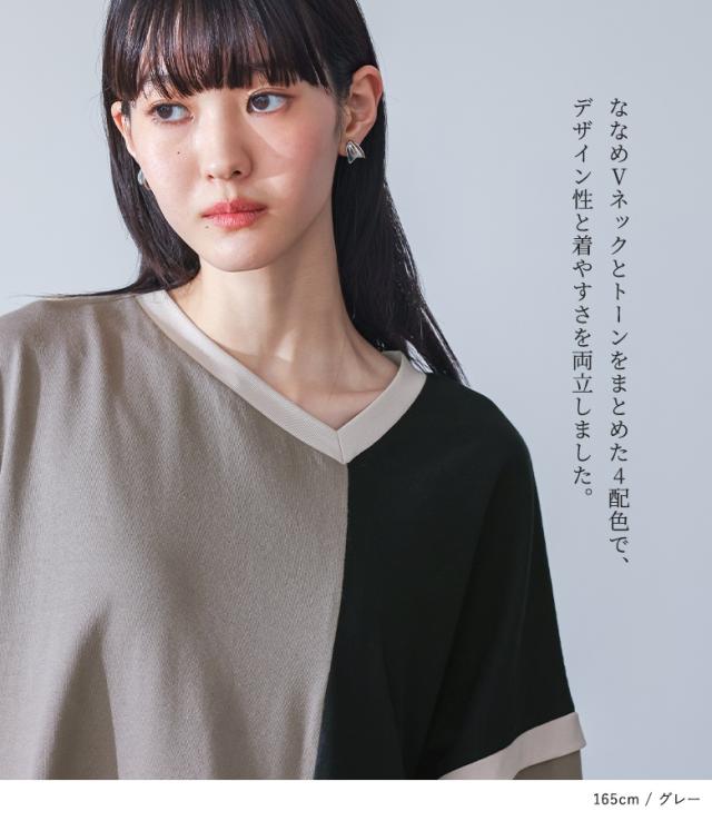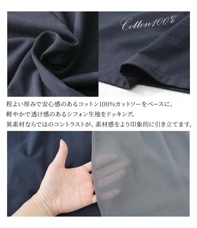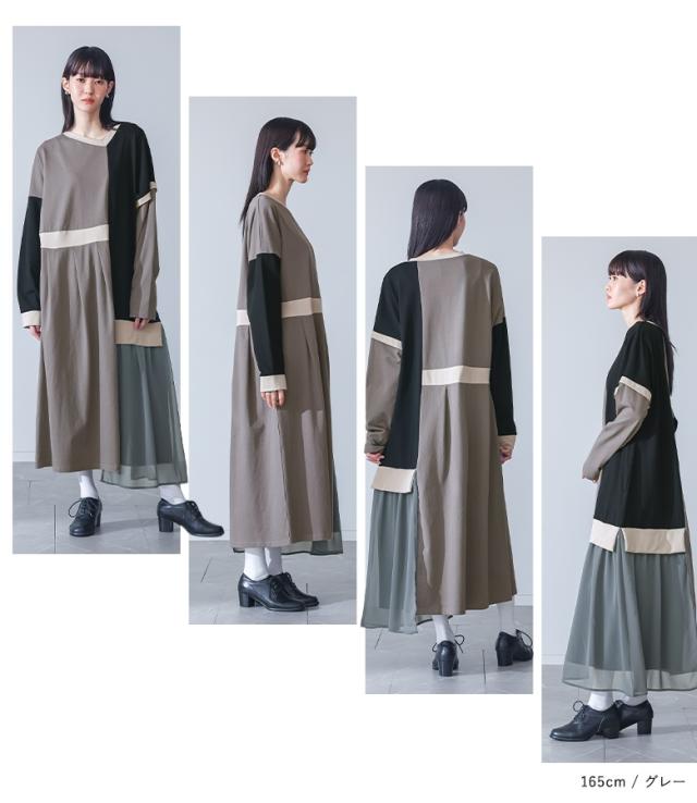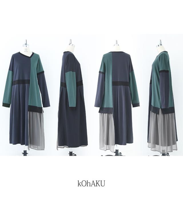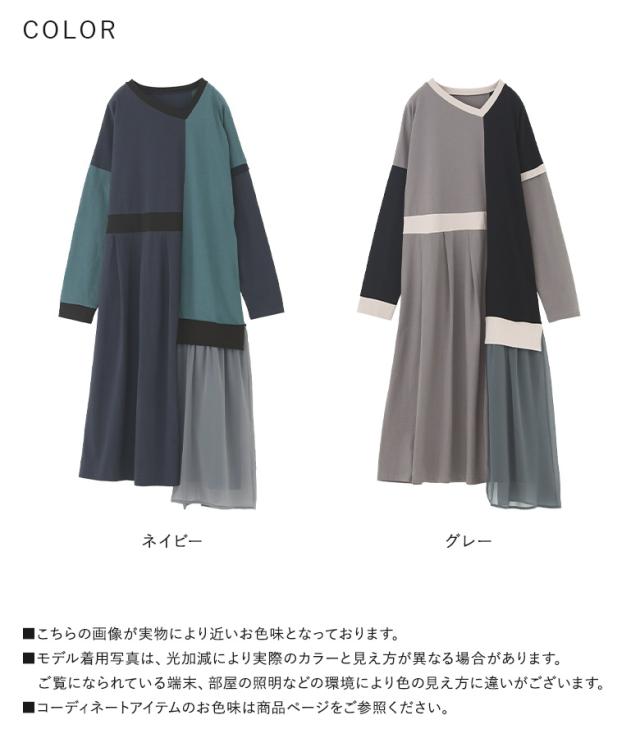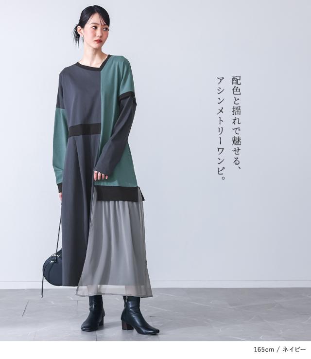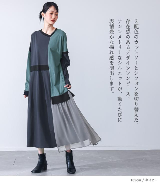 ワンピース 長袖 レディース ドレス ロングワンピース カットソー シフォン Vネック 配色 アシンメトリー アシメ 綿100% ゆったり 春 秋 【TP】 マキシワンピース カットワンピース ロング丈 マキシ丈 切り替え 無地 コットン100% 異素材 シアー 透け感 レイヤード 重ね着 ポケット おうちで洗える 冬 ロングシーズン カジュアル シンプル モード マニッシュ キレカジ フェミニン ゆる 楽ちん Sサイズ Mサイズ Lサイズ LLサイズ 3Lサイズ XLサイズ フリーサイズ ぽっちゃり 体型カバー 体形カバー 大きいサイズ プラスサイズ 10代 20代 30代 40代 50代 60代 低身長 高身長 女子会 オフィス 通勤 通学 お買い物 お出掛け 旅行 リゾート レジャー おしゃれ お洒落 トレンド 流行 kOhAKU コハク 大人女子 大人可愛い お洒落可愛い 大人カジュアル ラフ スタイリッシュ 洗練 エッジィ 上品 きれいめ かっこいい osharewalker オシャレウォーカー おしゃれうぉーかー ネイビー 紺 グレー 灰色 マルチカラー ミックスカラー[ID]11dp03p[kOhAKU配色カットソーワンピース]