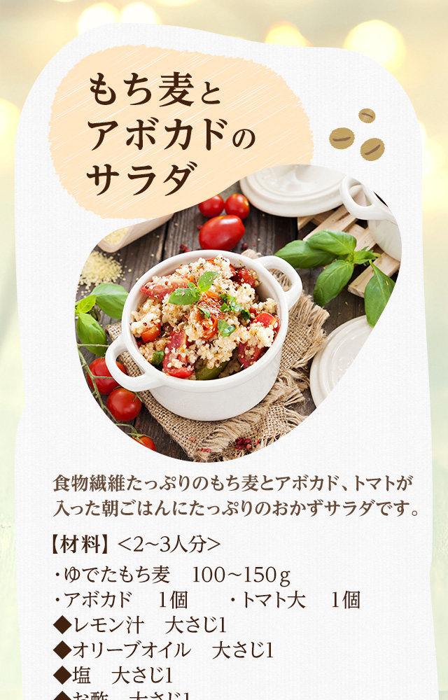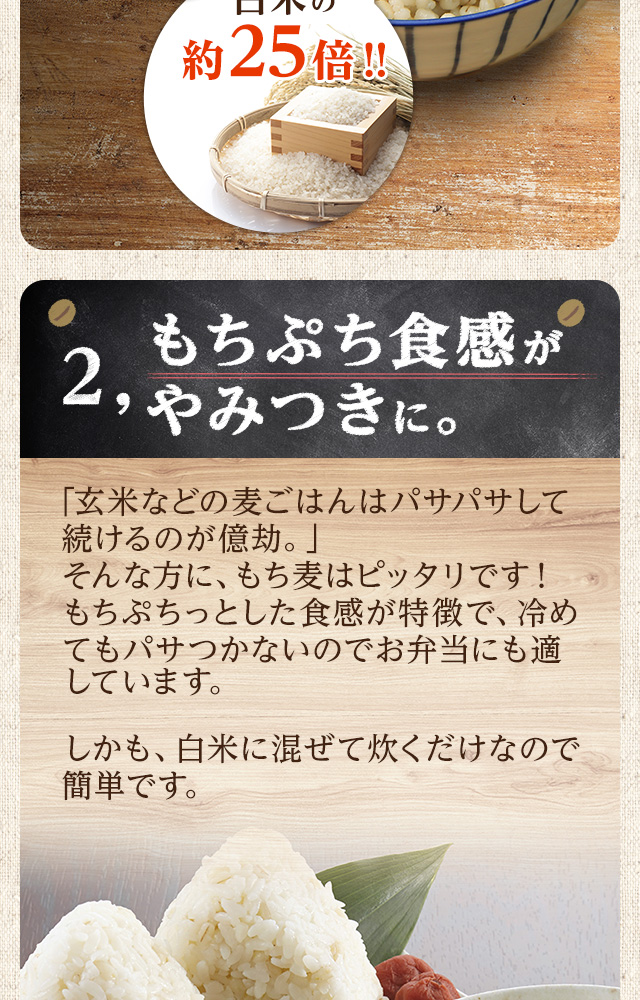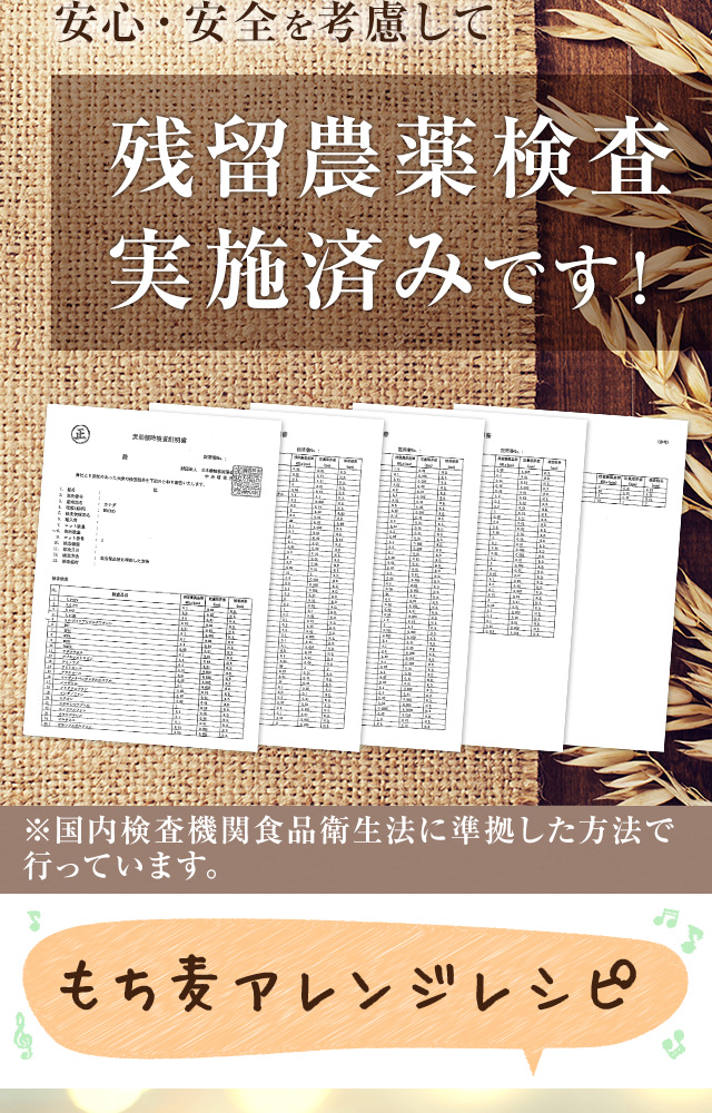 大麦は、β-グルカンという食物繊維が通常大麦の約2倍含まれており、もちもちぷちぷちの食感です。 残留農薬検査も実施済みです。