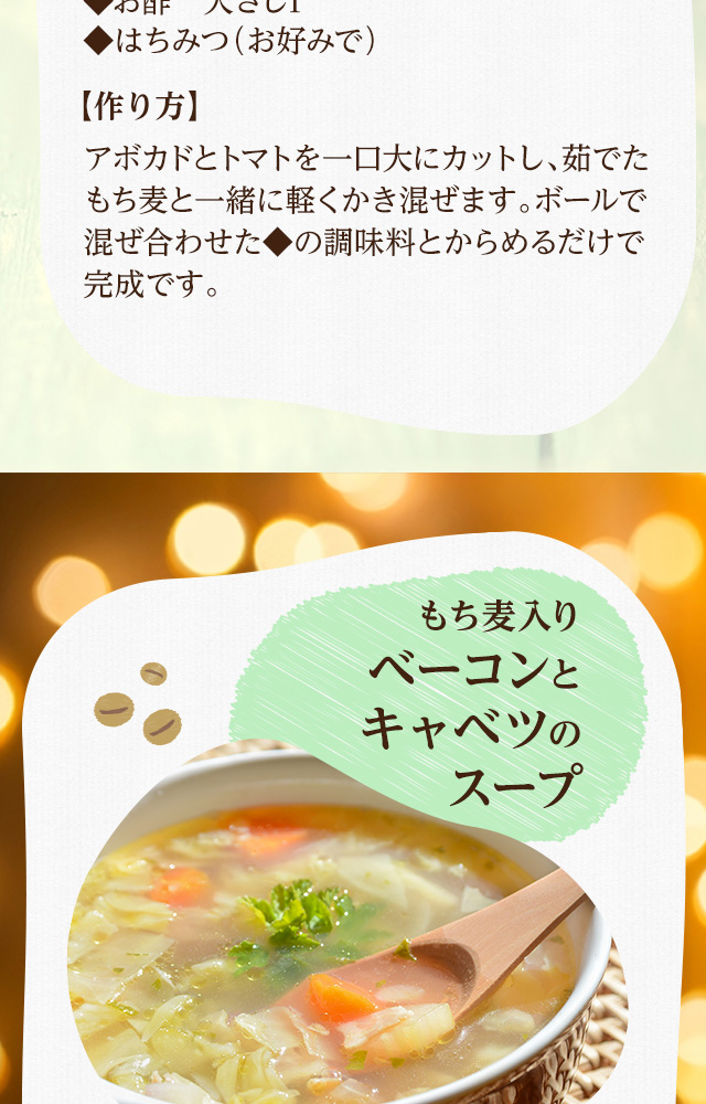 【大麦ごはん】 ⇒炊き方は簡単!洗ったお米に混ぜるだけ! もち麦量の2倍量の水を入れて炊飯してください。 (白米と混ぜる場合は、白米分の水量を追加し、もち麦と白米を軽くかき混ぜてから炊飯してください。) ※もち麦の割合は、3〜5割、10割などお好みで調整してお召し上がりください。 ※事前に30〜60分吸収させると、よりもちもちとした食感が味わえます。 【ゆで大麦】 ⇒ゆでたもち麦を、そのままサラダやスープ、ドリンクとして! (1)鍋に水を用意(麦に対してたっぷりの水量)します。麦を加え時間があれば30分浸水。 (2)塩(お好みで)を加え、沸騰したら軽く混ぜ15〜20分、お好みの硬さに茹でます。 火加減は吹きこぼれるといけないので注意してください。麦が軽く対流する位が丁度良いです。 もち麦の中心が透明になるまでゆでて下さい。 (3)お好みの硬さに茹で上がったら湯を切り流水でぬめりをよく洗い流します。水分をしっかり切ってください。 2〜3日なら蓋つき容器に入れて冷蔵庫、それ以上の場合は小分けにし冷凍保存します。使用するときはレンジまたは湯通ししてください。 |