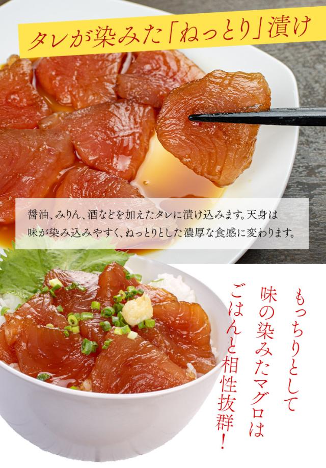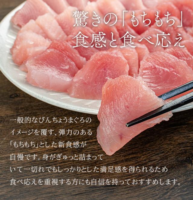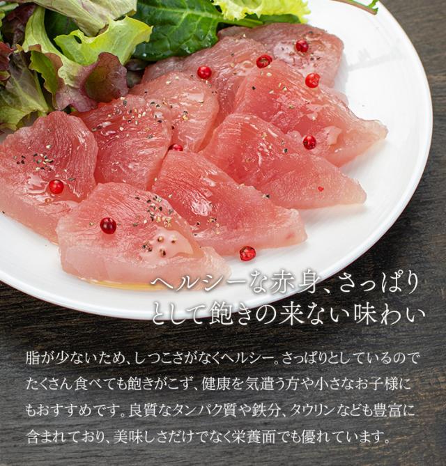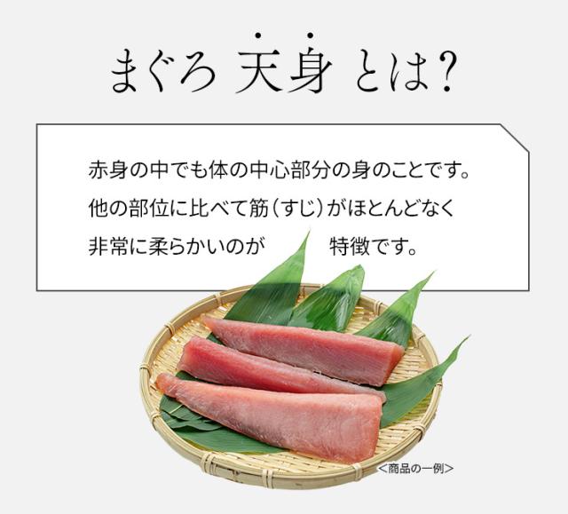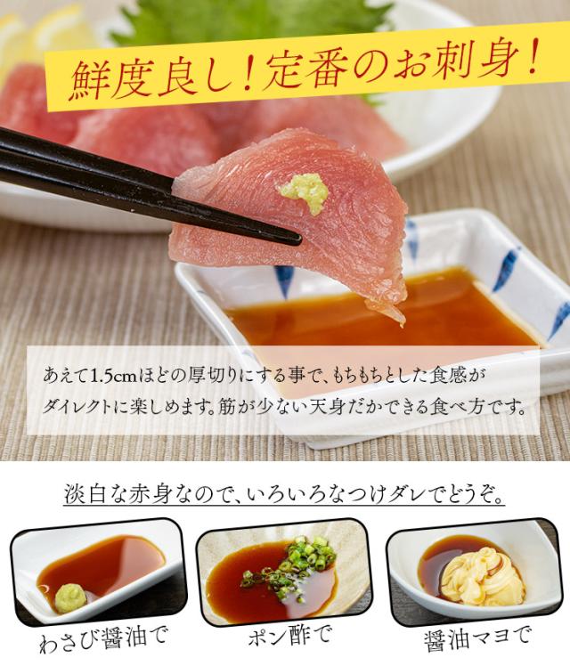 筋が少なく柔らか、もちもちっとした食感の赤身「天身」を使用。ねっとり吸い付くような新食感が楽しめます。骨・皮・血合い処理済、解凍後は切るだけでお刺身として召し上がれます。いろいろなつけダレで、漬け丼やカルパッチョ、レアカツなどもおすすめです。