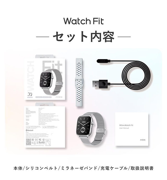 | 付属品 | 時計本体(純正バンド含む) 専用充電ケーブル、ユーザーマニュアル 替えベルト付き(シリコン) |
