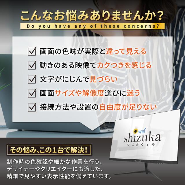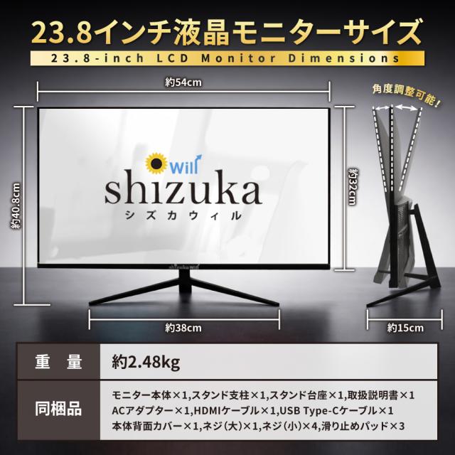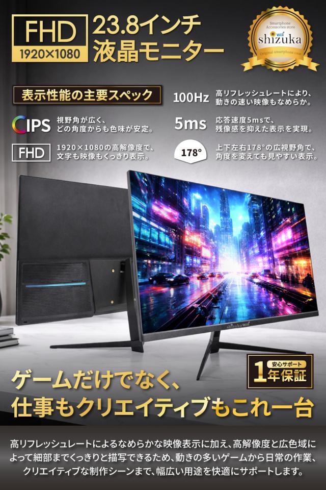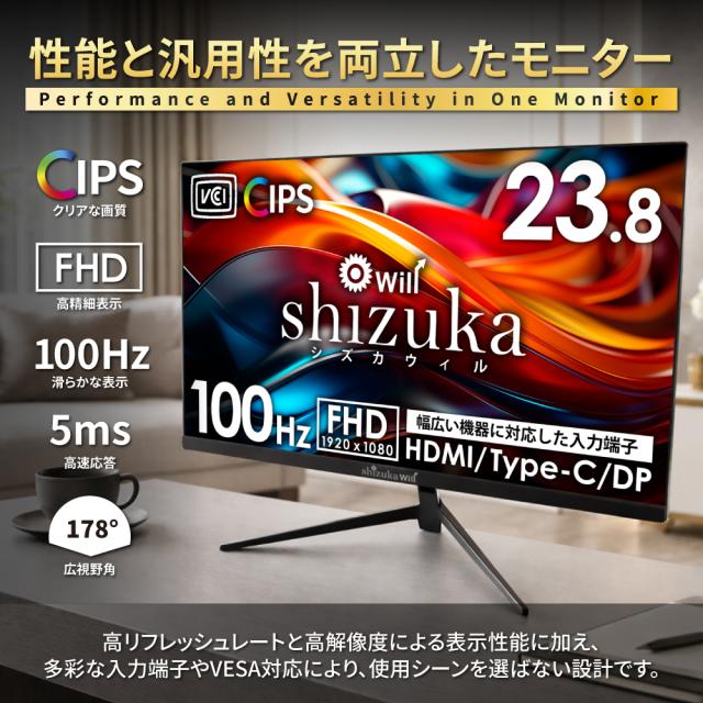 23.8インチ 液晶モニター ゲーミングモニター FHD 1920×1080 100Hz 対応 液晶ディスプレイ PCモニター DisplayPort HDMI Type-C 広視野角 IPSパネル VESA対応 シズカウィル 【最大1年保証】