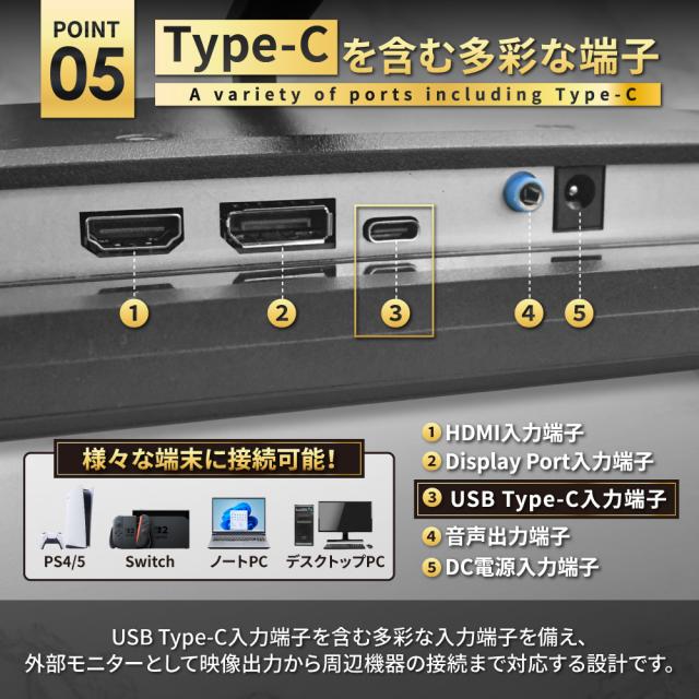 | 入出力端子 | HDMI 入力×1 / DisplayPort 入力×1 / USB Type-C 入力×1(映像入力対応) / 音声 出力×1 |