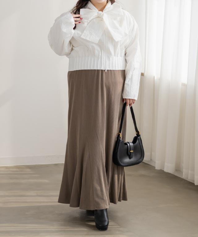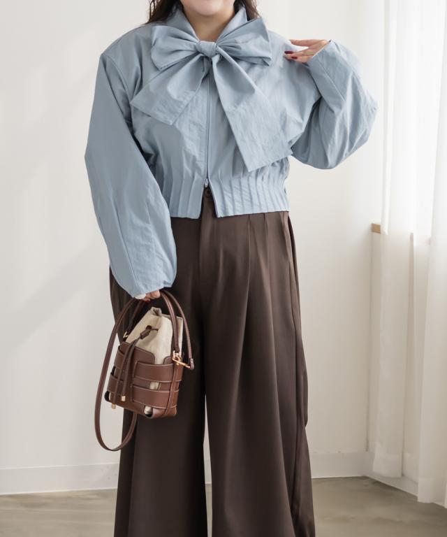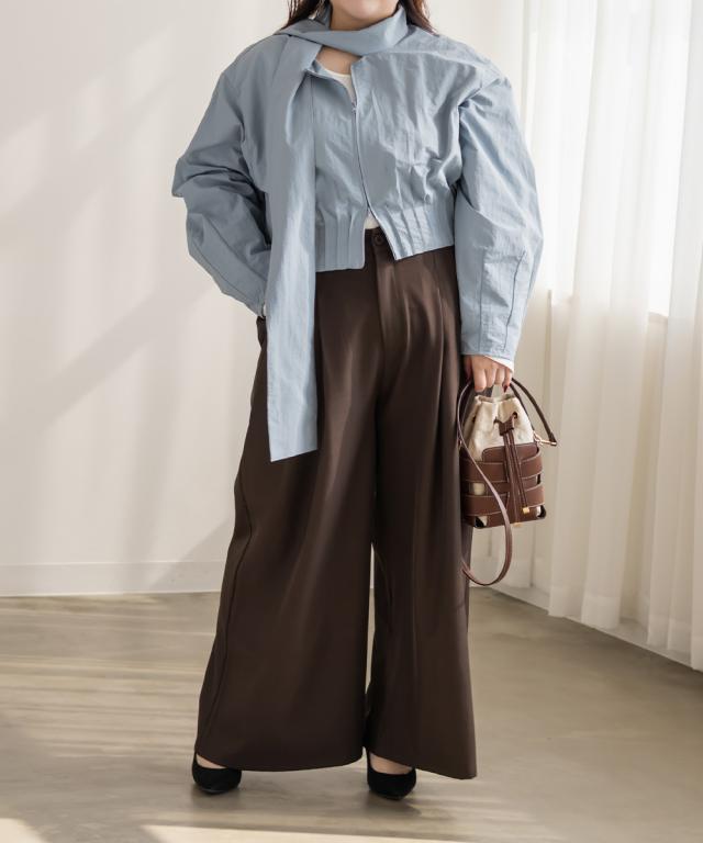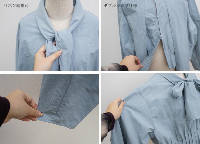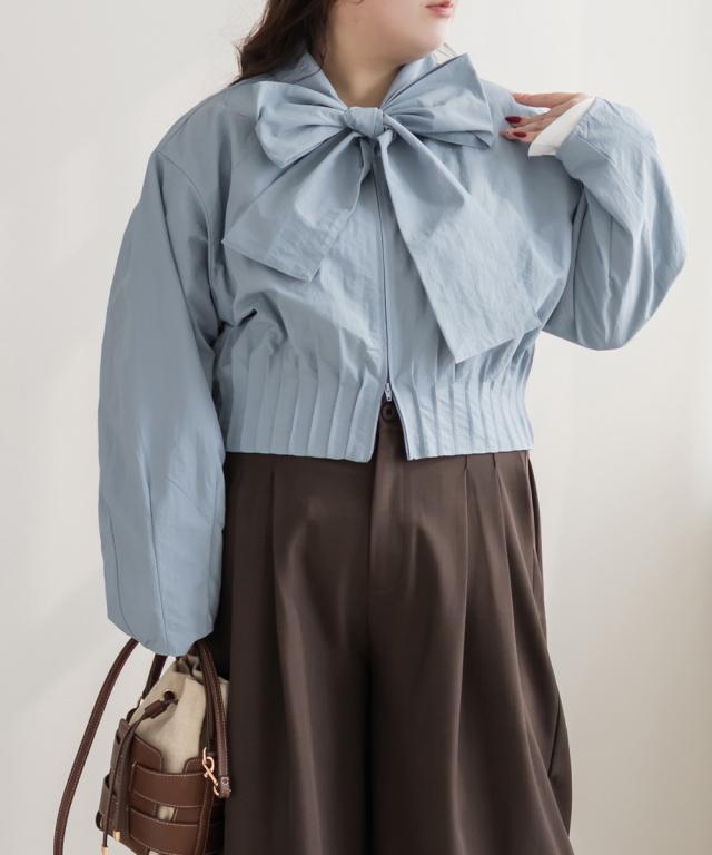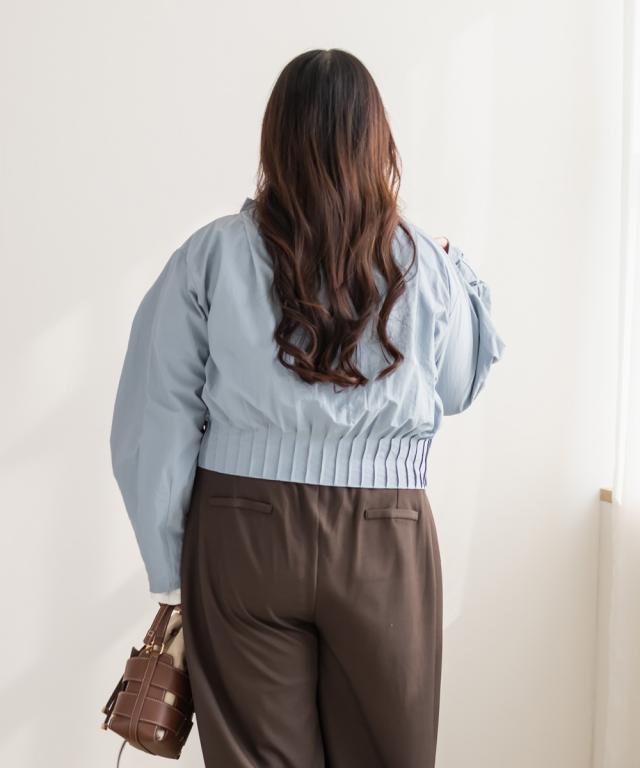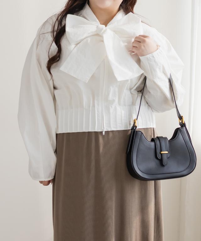 | 3Lサイズを着用しました。身幅や腕まわりに程よくゆとりがあり、全体的にちょうどいい着心地でした。ハリのあるシャカシャカとした軽い素材で、肌離れがよくさらっと着られます。ダブルジップ仕様なので開き具合を調整でき、ボウタイデザインも甘くなりすぎず大人かわいい印象に仕上がるのが嬉しいポイント♪ 軽いアウターとしても使えるので、気温差のある時期にも活躍してくれそうです◎ パンツ合わせでクールに、スカート合わせでフェミニンにも着られて、着回し力の高いブラウスだと思いました。 |