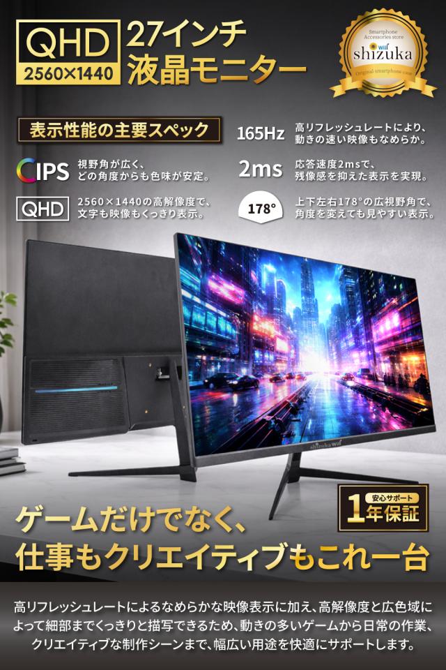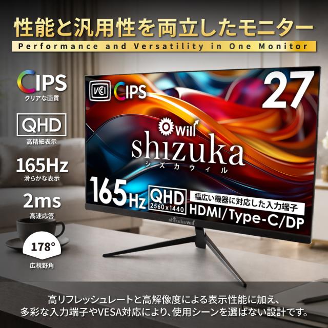 27インチ 液晶モニター ゲーミングモニター QHD 2560×1440 165Hz 対応 液晶ディスプレイ PCモニター DisplayPort HDMI Type-C 広視野角 スピーカー内蔵 VESA対応 シズカウィル 【最大1年保証】