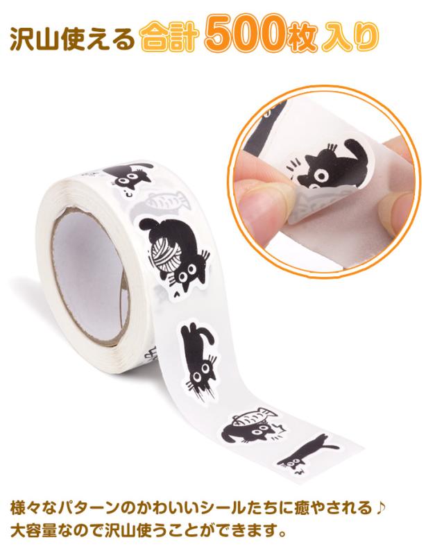 猫 ロールシール 猫シール ねこ シール 500枚 おもしろ かわいい アニマルシール 動物シール 猫グッズ キャット 文房具 ステーショナリー 猫雑貨 黒猫 ラッピング用品