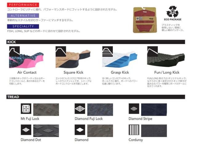 WCT選手など世界的サーファーのニーズを満たすモデルを中心にバリエーション豊かなラインナップを誇るTLSトラクションシリーズ