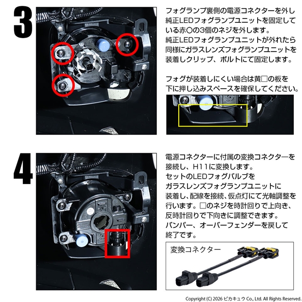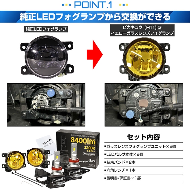 純正LEDフォグランプから明るいLEDフォグランプを装着出来るキットです。 本製品は純正フォグランプユニットから「イエローガラスレンズフォグランプユニット」に交換し、ピカキュウ人気モデル「LEDモンスター8400ルーメンフォグバルブ」を装着するキットです。