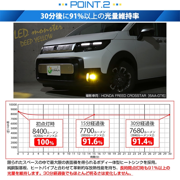 明るさ全光束8400ルーメンの最強のモンスターフォグランプLEDバルブです。放熱性能が高いため、長時間点灯後も91%以上の光量を維持します。30分経過後もほとんど明るさが変化しない放熱対策を施しています。純正球の配光特性に徹底的にこだわり、理想的な配光を実現しています。
