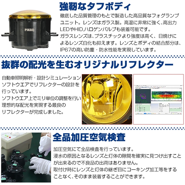 金型から設計したピカキュウオリジナルの幅細リフレクターにより抜群の配光を実現しています。イエローレンズは、装着するバルブカラーによりイエロー光の濃淡をつけることが出来ます。非点灯時も愛車の存在感をアピールします。