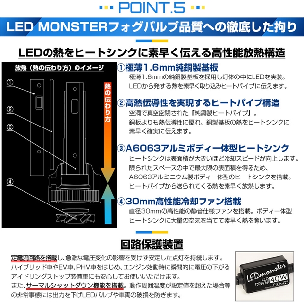 [5][サーマルシャットダウン機能を搭載]:バルブの動作周囲温度が設定値を超えた場合等の非常事態には出力を下げLEDバルブや車両の破損を防止。