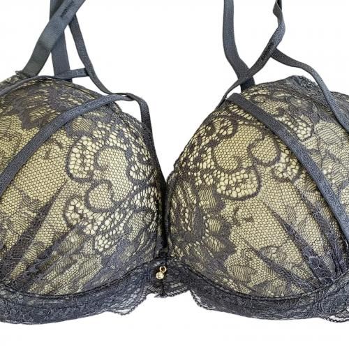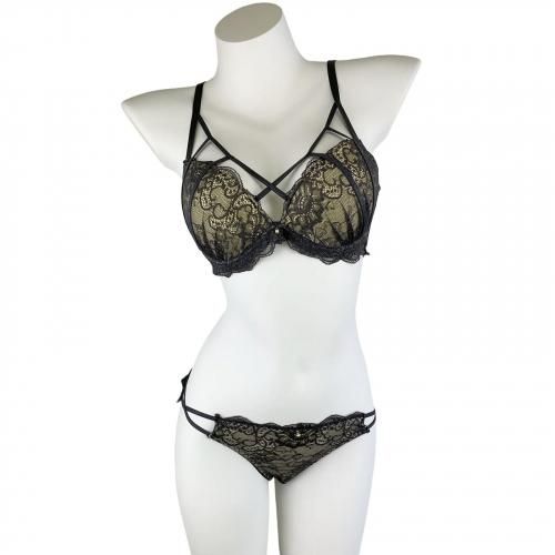 ベージュのベース素材に繊細なレースを重ねたヌーディーな透け感と、前中心で大胆に交差する「クロスストリング」が都会的な色香を放つ、インポートライクなブラ&ショーツセット。