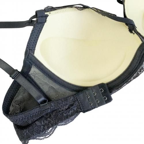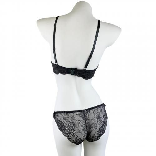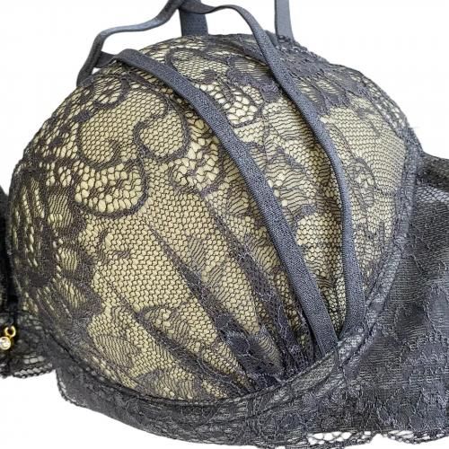 バストを自然に押し上げる「下厚モールドカップ」と痛くなりにくいL字ワイヤーが、楽な着け心地で美しい谷間をキープしつつ、セットのショーツにはサイドのクロスストリングとヒップを贅沢に彩る「総レース仕様」を採用しており、タイトなボトムスにも響きにくい実用性を備えながら、360度どこから見ても圧倒的な官能美を演出するドラマチックな一着です。