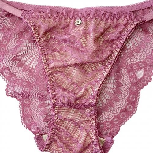 ブラジャーのフロントには印象的な「クロスストリング」をあしらい、総レースの華やかさと相まって洗練された大人の色香を演出しつつ、セットのショーツにはヒップを贅沢に彩るフルレース仕様を採用することで、日常の快適な着け心地はそのままに、素肌に浮かび上がるレース模様が360度どこから見てもドラマチックなスタイルを約束する一着です。