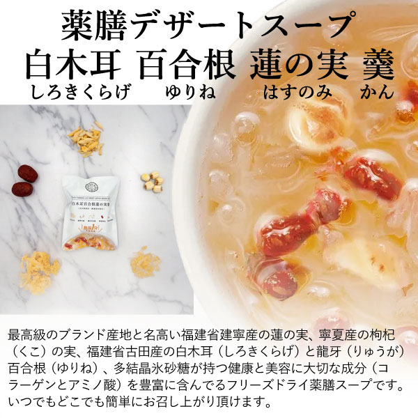 白木耳のトロトロ滑らかな食感と、ホクホクで甘い香りの蓮の実と百合根、ほんのり優しい甘みの氷砂糖、枸杞の実のコクのある風味を同時にお楽しみいただける美味しくヘルシーな「フリーズドライ薬膳スープ」はいかがでしょうか?