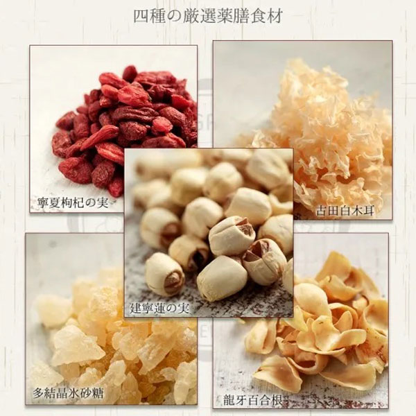 癒雅の薬膳食材を使用した完全無添加の本格薬膳スープ。建寧蓮の実、寧夏枸杞の実、古田白木耳と龍牙百合根、多結晶氷砂糖が持つ健康と美容に大切な成分(コラーゲンとアミノ酸)をマルチに含んでおり、その有用な成分を余すことなく吸収できるように開発したフリーズドライ薬膳スープなので、いつでもどこでも簡単に即お召し上がり頂けます。