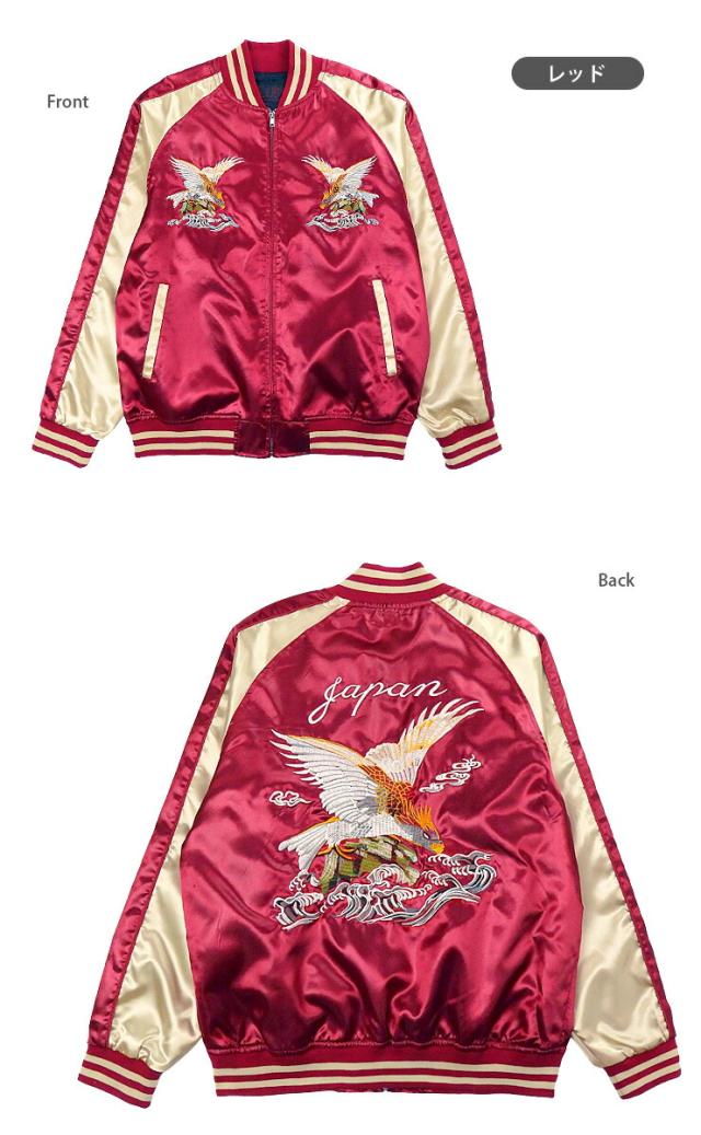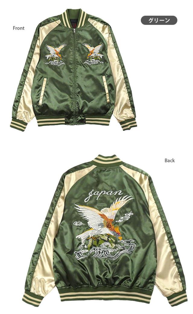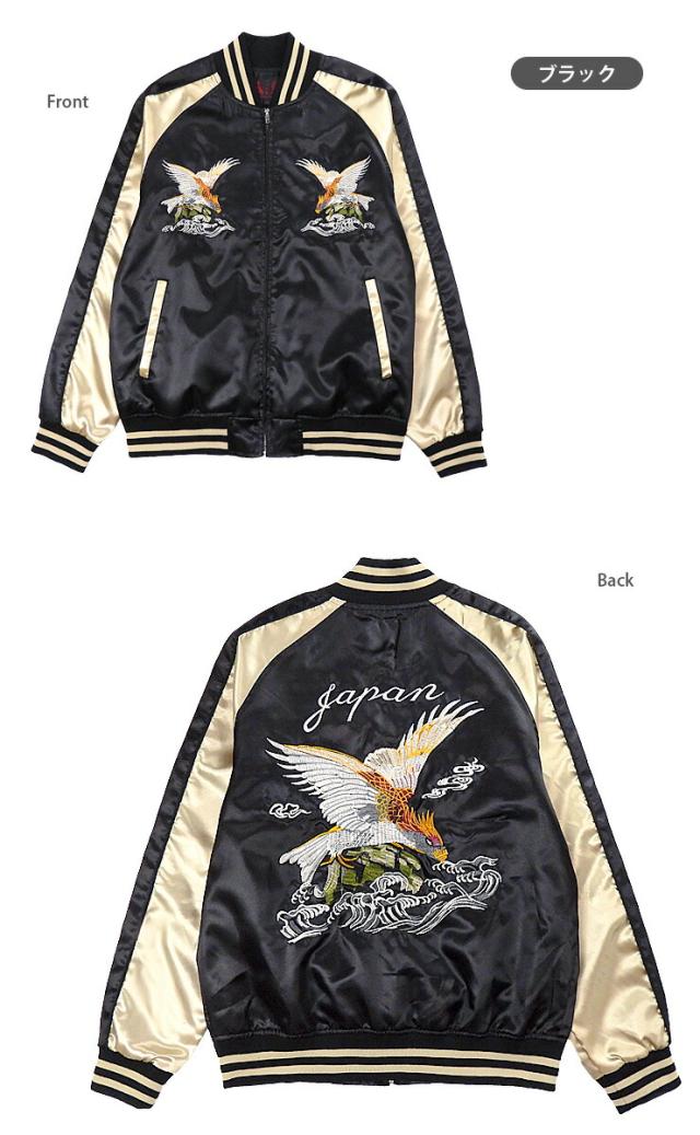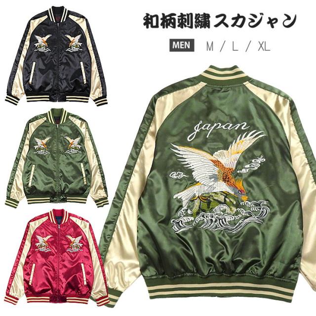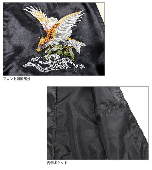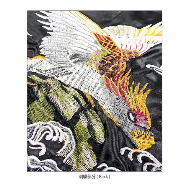 イーグル柄 サテン スカジャン メンズ 春秋冬 M L XL 長袖 53610 ブラック グリーン レッド 一心如鏡 紳士 男性 鳥 鷲 ワシ 和柄 和風 本刺繍 ポケット BLACK D/GREEN RED 【大きいサイズあり】3126