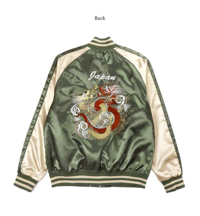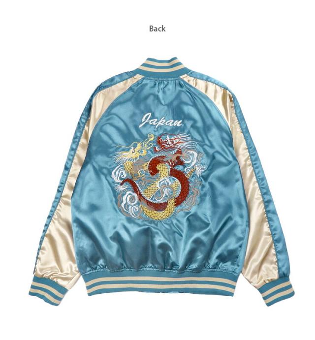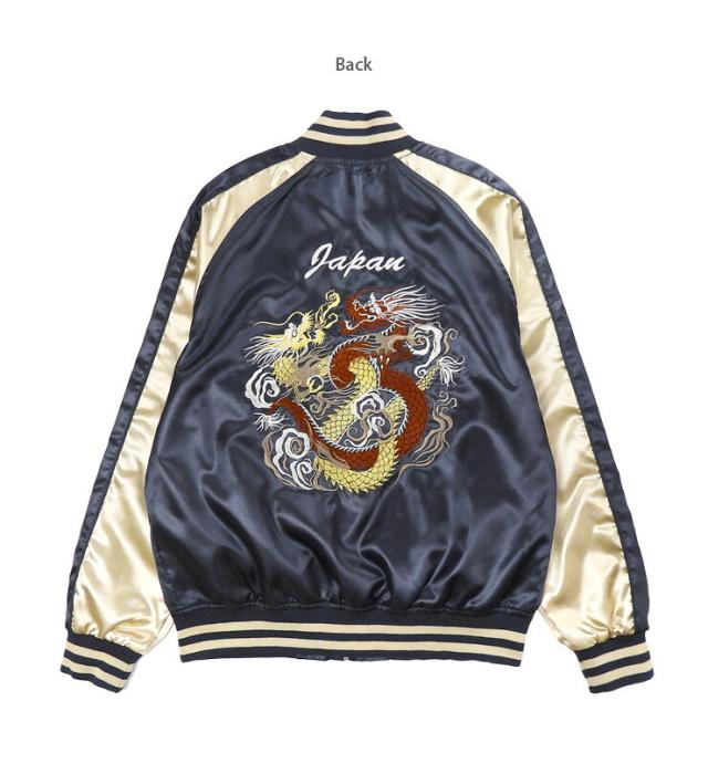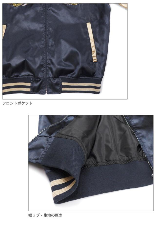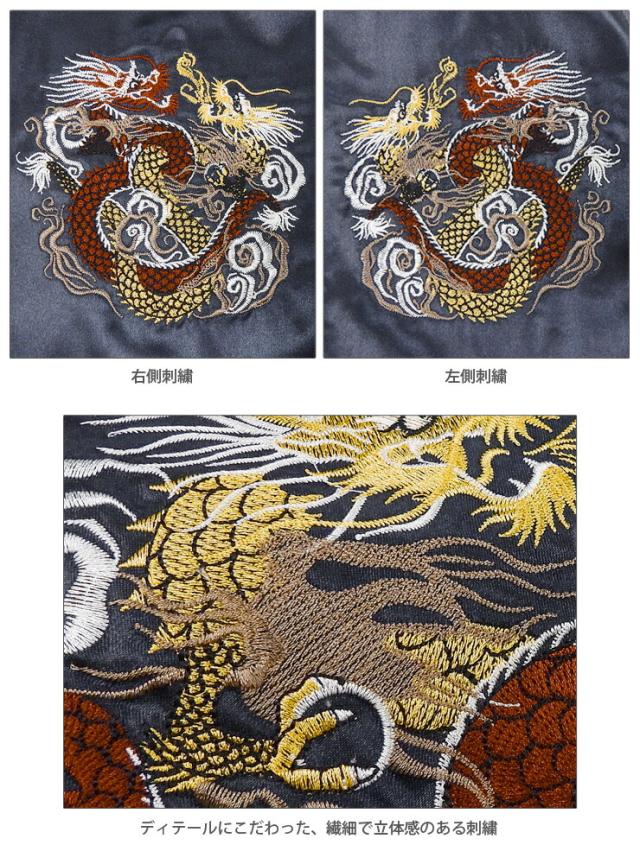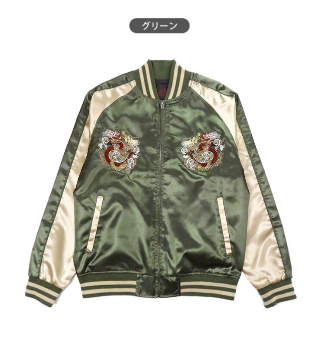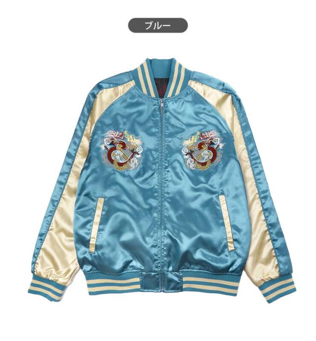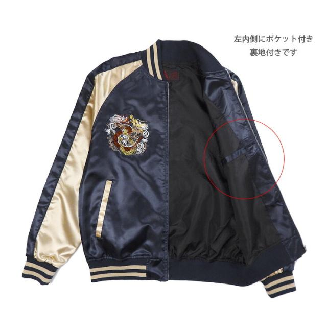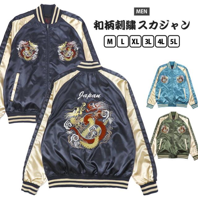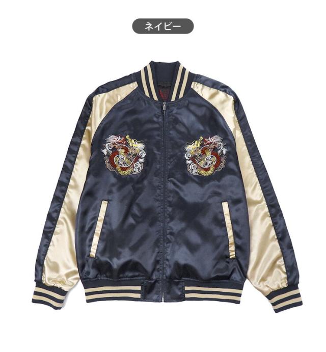 双龍柄 サテン スカジャン メンズ 春秋冬 M L XL 3L 4L 5L 長袖 53612 53612K ネイビー ブルー グリーン ゴールド 一心如鏡 紳士 男性 和柄 和風 竜 ドラゴン 本刺繍 ポケット NAVY BLUE D/GREEN 【大きいサイズあり】3131