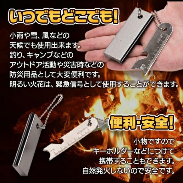 明るい火花は、緊急信号として使用することができます。小物ですのでキーホルダーなどにつけて携帯することもできます。自然発火しないので安全です。