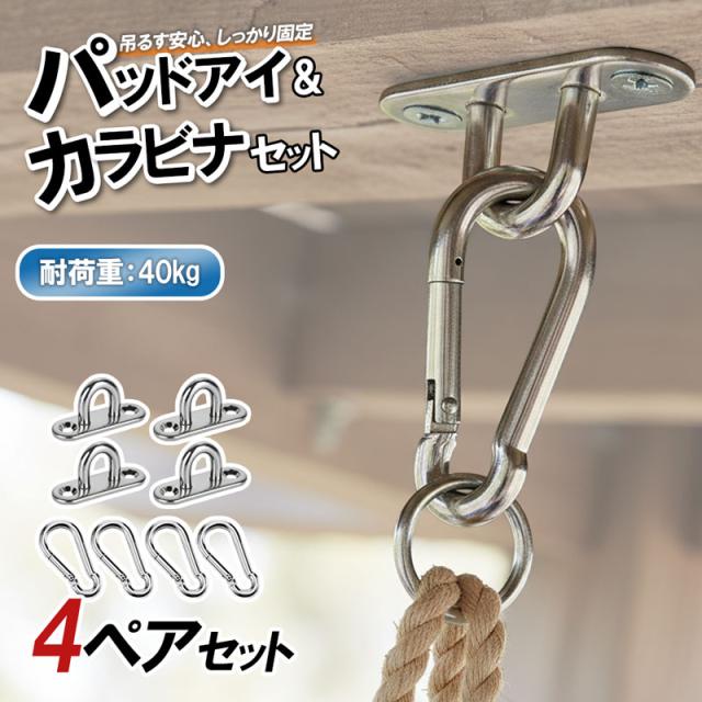 錆びに強く耐久性に優れた高品質なステンレスを採用した、パッドアイとカラビナの4組セットです。
