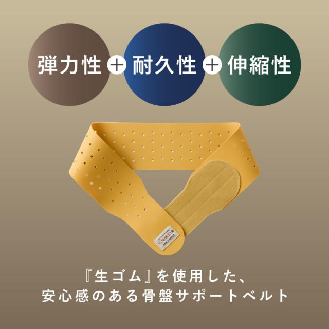 しっかり支えて、毎日の動きを快適に。弾力性・耐久性・伸縮性に優れた生ゴムを使用した、安心感のある骨盤サポートベルトです。身体にやさしくフィットし、骨盤まわりを安定させます。