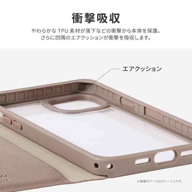 【耐衝撃】【薄型】 写真やステッカーを使ったアレンジも楽しめる背面クリアフラップケース/着脱時も割れにくい柔軟で高透明なポリカーボネート/便利なカード収納(1枚)+大型ポケット/ボタンやカメラレンズを保護する精密設計/ピタッと固定できるマグネット仕様/側面周囲に衝撃を吸収するエアクッションを搭載/ストラップホール搭載。