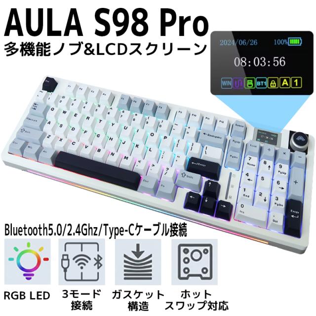 AULA S98 PRO ワイヤレス ゲーミングキーボード メカニカルキーボード 98キー 96%レイアウト LCDスクリーン 多機能ノブ搭載 Bluetooth5.0/2.4Ghz/Type-Cケーブル ホットスワップ可能 充電式バッテリー 技適認証取得 KY-01WH