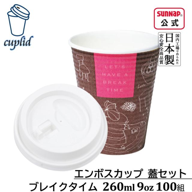 cuplid エンボスカップ ブレイクタイム 260ml リフトアップリッド 白 100組【 蓋付 蓋付き紙コップ 日本製 東罐 ふたセット】