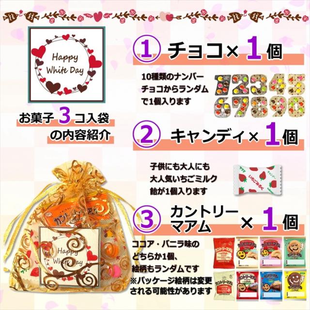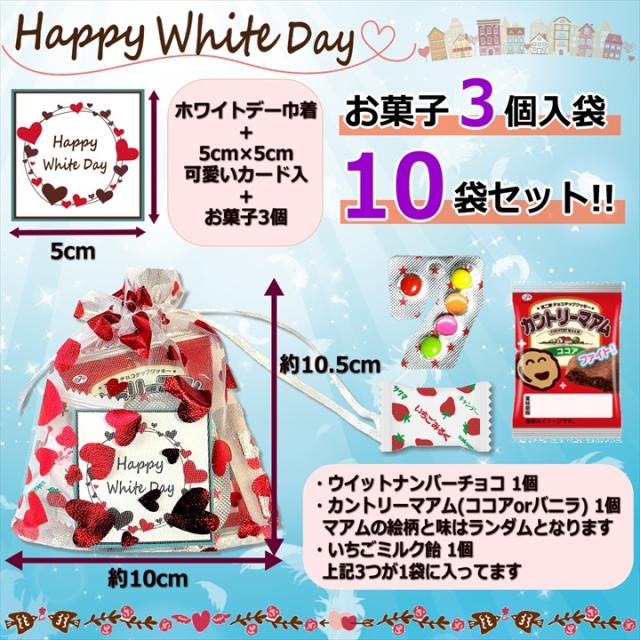 内容: 3個のお菓子+カード入巾着 × 10袋(袋自体のサイズ: 縦約10.5cm 横約10cm)