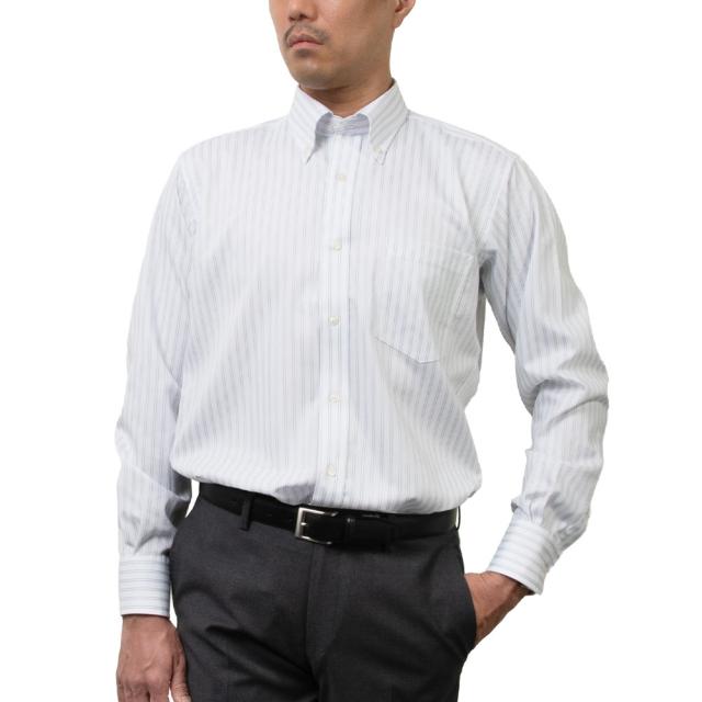 進化した、綿100%形態安定シャツ【日清紡アポロコット】ドレスシャツノーアイロンシャツ ノンアイロン ボタンダウンシャツ1枚でもきまるストライプ柄シャツ。ホワイトベースに、さりげないブルー枠のストライプが爽やかさを演出します。衿はボタンダウンですので、ネクタイありなし双方お楽しみ頂けます。カフスには両方ボタンホールがあるので、カフスボタン(カフリンクス)を通していただけます。綿100%で薄手ながらもさらりとした生地に、柔らかな肌触りです。テープ縫製による縫い代のシワ軽減や、縫製後の特殊な熱処理で驚異の形状記憶性を実現。ご家庭で洗濯されてもシワが気にならないので、お手入れが簡単で家事の手間が削減されます。