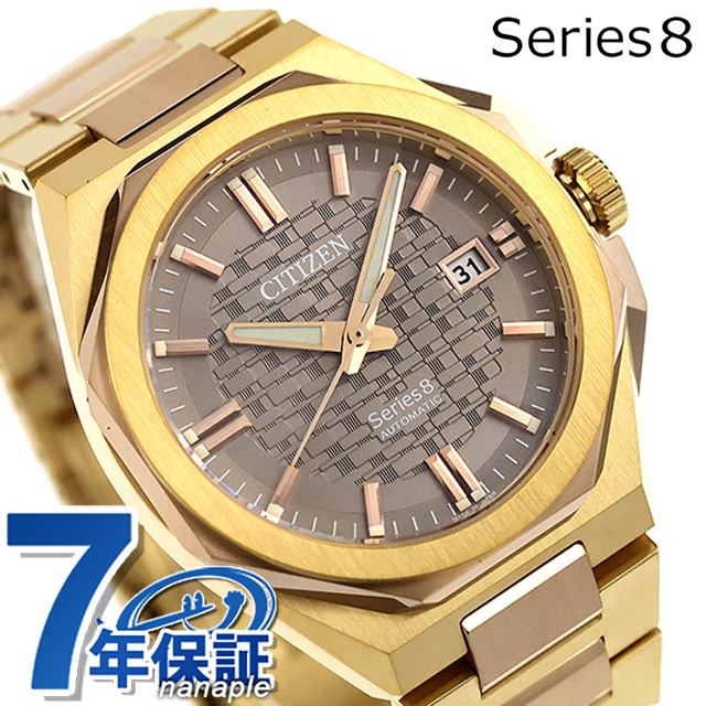 3月19日発売予定 予約受付中 正規品 7年保証キャンペーン 送料無料 シチズン シリーズ8 メカニカル 日本製 自動巻き メンズ 腕時計 NB6085-57W CITIZEN Series 8 アナログ ブラウン ゴールド ◆エッジの効いたモダンデザインと高い実用性を兼ね備えた日本発の機械式時計ブランド、「Series 8(シリーズエイト)」。洗練されたデザインに、エレガントな印象をプラス。サイズ感とフィット感にこだわった、定番ウオッチの新作です。薄型ムーブメントCal.9051を搭載し、世界的なトレンドである少し小さめのサイズを実現。腕なじみが良く、快適なフィット感にこだわりました。5つのパーツで構成された薄型のケースは、それぞれのパーツを徹底的に磨き上げ、シャープでエッジの立ったデザインに仕上げました。文字板を彩るSeries 8のオリジナルパターンとインデックスが、スタイリッシュな印象の中にもエレガントな雰囲気を漂わせます。裏ぶたはムーブメントの動きを楽しめるシースルーバック仕様。磁気による時刻のズレを防ぐSeries8の基本性能「耐磁2種」も備えています。 発売日:2026年3月発売 機械式腕時計