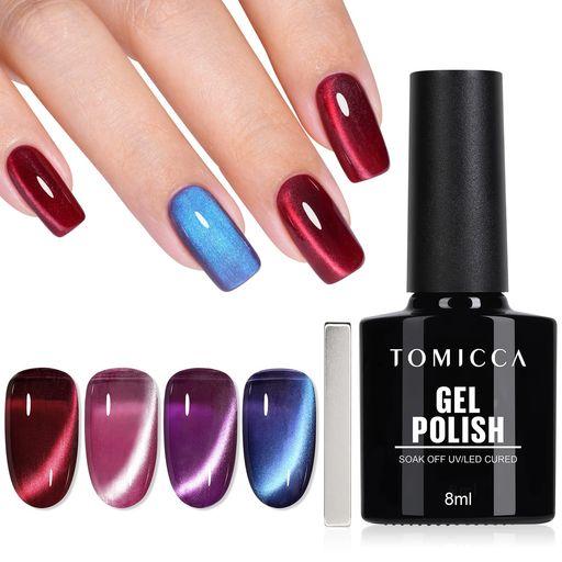 明るい色と光沢感が強い: Tomicca マグネットジェルネイルカラー セットポリッシュには、ピンクパープル、青、紫、濃い赤など 4 つの光沢のある色があり、付属の磁石でさまざまな模様を楽しむことができます。角度によって煌めくのでとても美しい仕上がりです。