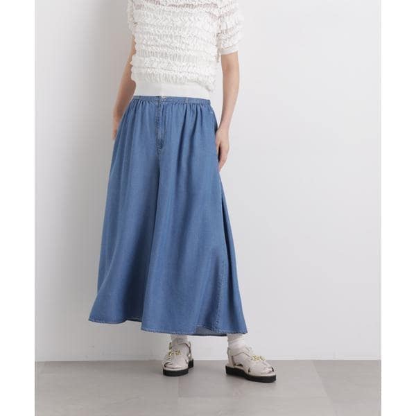 女性らしい揺れ感を表現できるテンセル100%の素材で仕立てたデニムパンツ。ギャザーをふんだんに入れたワイドシルエットで、歩くとドレープが綺麗に揺れる動きが楽しめる一着です。