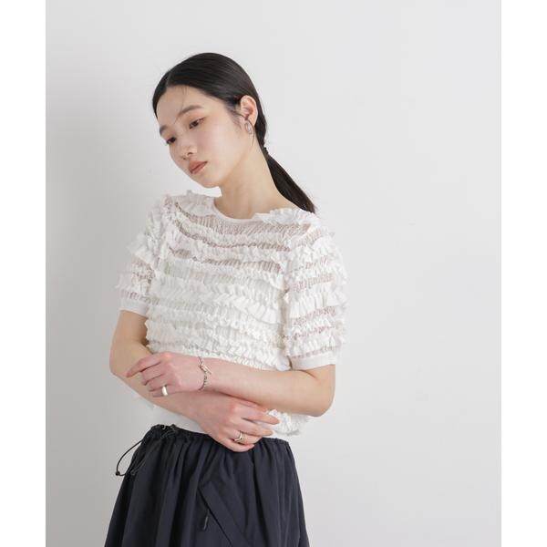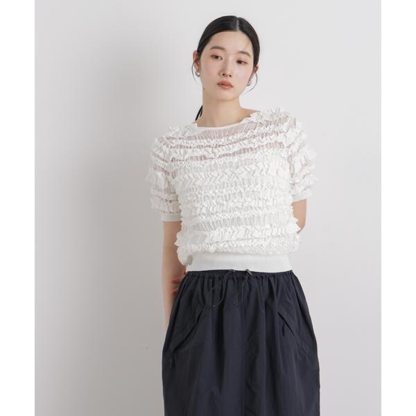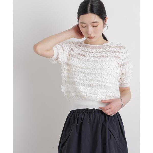 繊細さとクラフト感を併せ持った、存在感のある半袖ニットトップス。レースのような透かし柄で編み立てた土台の上に、共糸の総針テープをシャーリング糸でたたき、フリル状に何列も配置した拘りのデザインです。