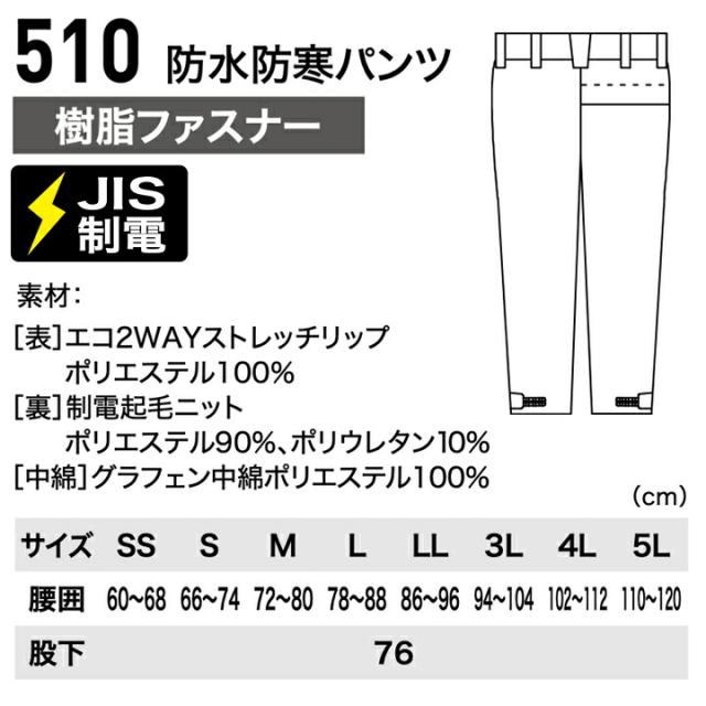 | 商品名 | ジーベック ストレッチ 防水防寒 パンツ 510 秋冬 遠赤外線 セットアップ ユニセックス メンズ 作業服 作業着 XEBEC |