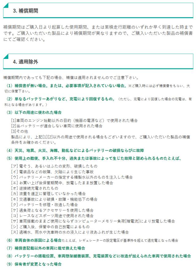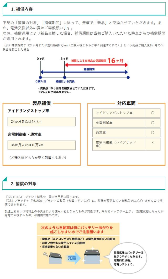 | 製品補償 | ■アイドリングストップ車 24か月または4万km ■充電制御車・通常車 36か月または10万km ※ご購入後どちらか早く到達するまで |