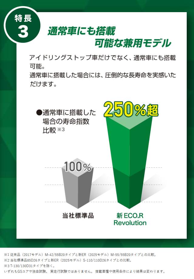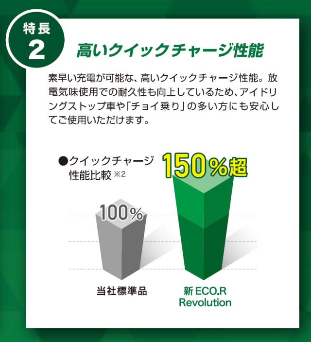 ECO.R Revolutionは、 アイドリングストップ車 (新車搭載よりアイドリングストップ車用バッテリーを搭載している車)・通常車に対応可能です。