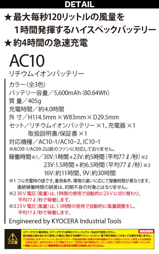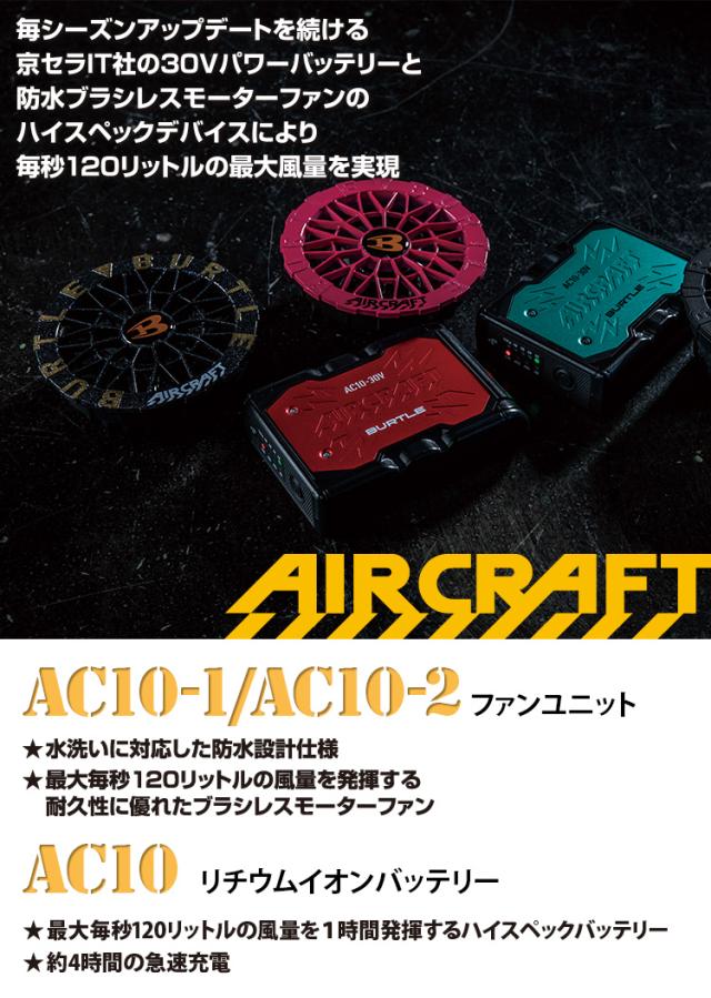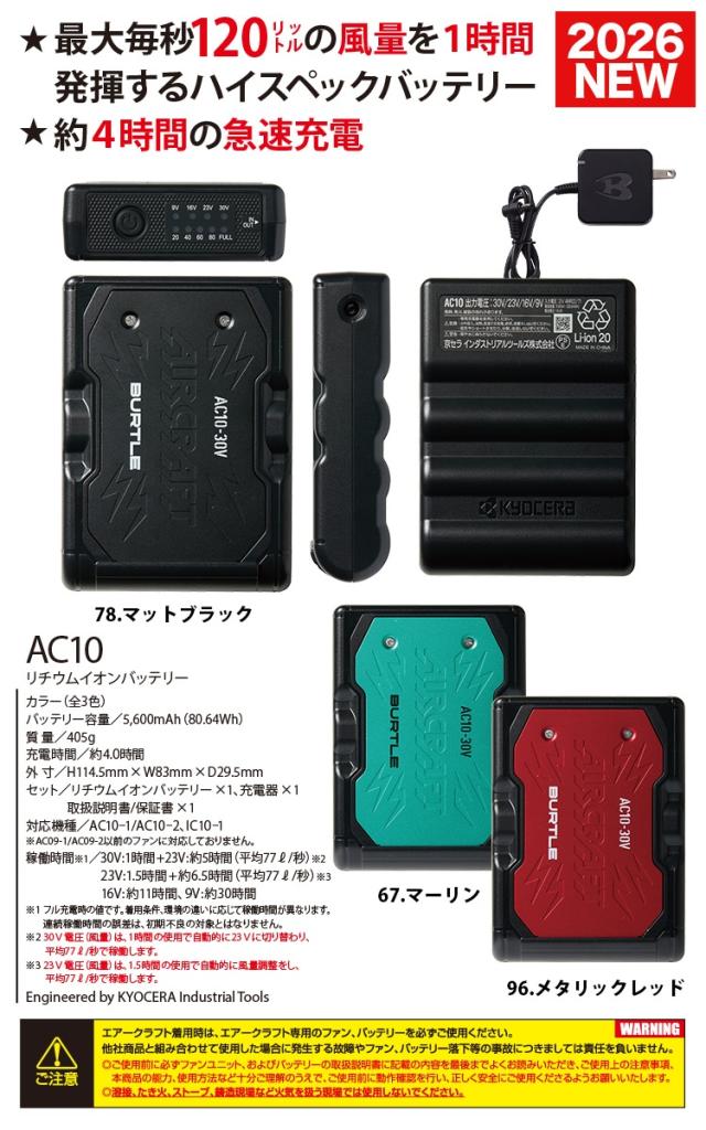 BURTLE バートル エアークラフト 2026年新型 30V リチウムイオンバッテリー/ファンユニットセット AC10&AC10-1/AC10-2 作業服 作業着 熱中症対策 空調 ハイスペック エアークラフト 急速充電 30ボルト 大風量120リットル KYOCERA 京セラ