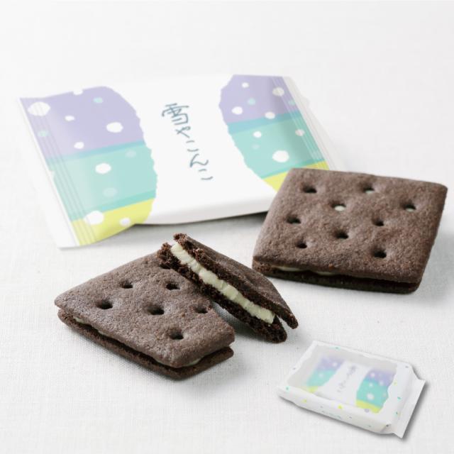 ブラックココア入りのビスケットで、すっきりとした甘さのホワイトチョコクリームをサンドしました。