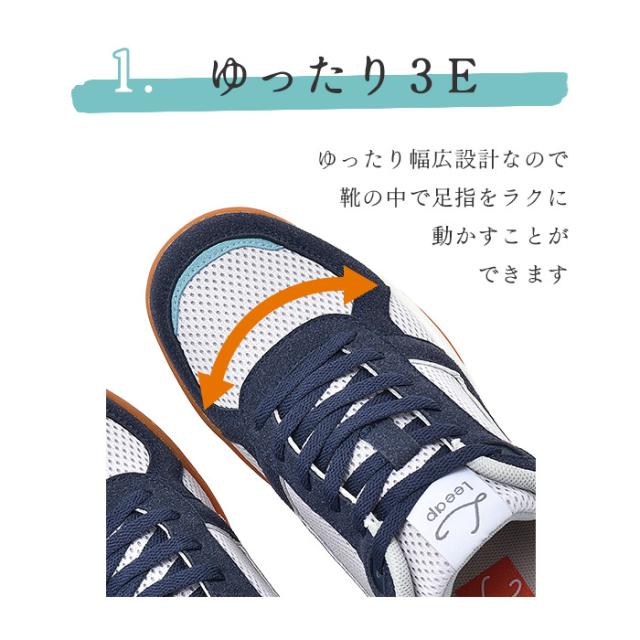 ゆったり3Eの幅広ワイズで足指をラクに動かせるため、長時間の立ち仕事や歩き回る場面でも締め付け感を抑えて快適な履き心地をキープ。