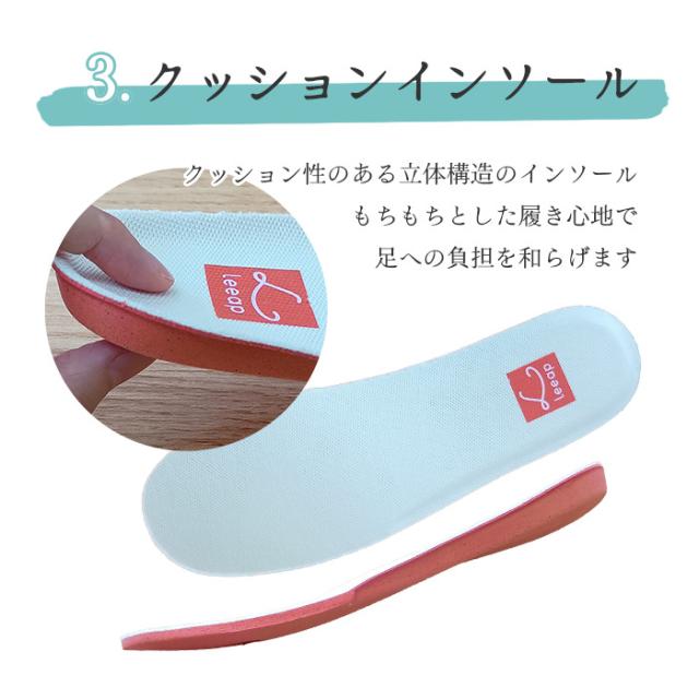足裏にはクッション性のある立体インソールを搭載し、歩行時の衝撃をやわらげて負担を軽減。