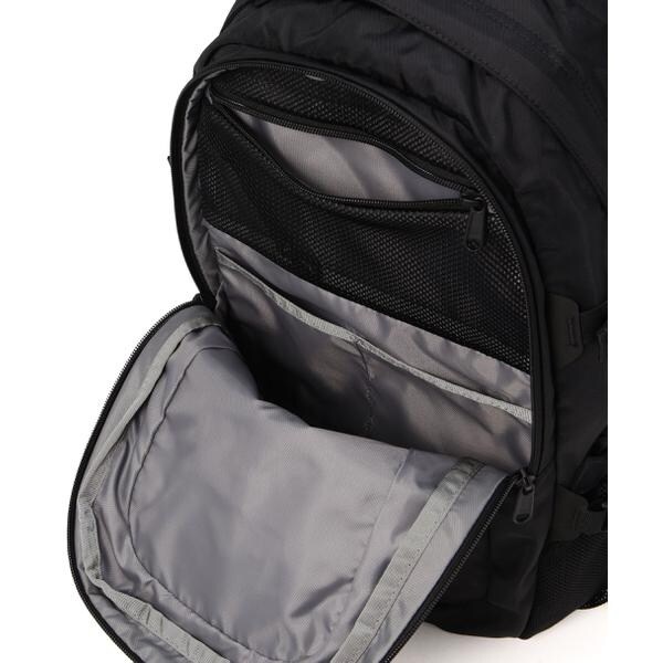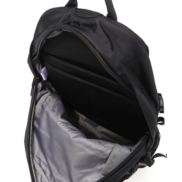 メインコンパートメントは、大きく開閉するパネルローディングタイプ。15インチまでのノート型PC専用スリーブとハイドレーション用のスリーブポケット付き。メイン生地と補強生地の両方にリサイクル素材を採用し、環境保護へも配慮しています。