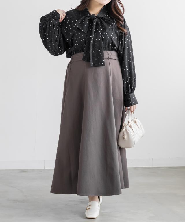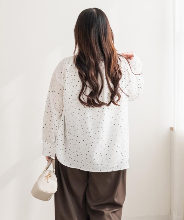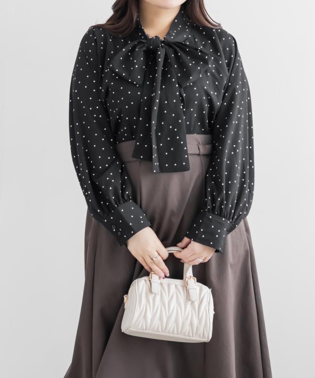 | 3Lサイズを着用しました。身幅や腕まわりに程よくゆとりがあり、全体的にちょうどいい着心地でした。ドット柄とボウタイデザインが上品な華やかさをプラスしてくれて、顔まわりがぱっと明るい印象に見えます。甘くなりすぎないバランスなので、大人フェミニンに着られるのが嬉しいポイント♪ ボウタイは結び方で雰囲気を変えられるので、きれいめにも少しカジュアルにもアレンジ可能です◎ スカート合わせで華やかに、パンツ合わせで通勤スタイルにもおすすめのブラウスだと思いました。 |
