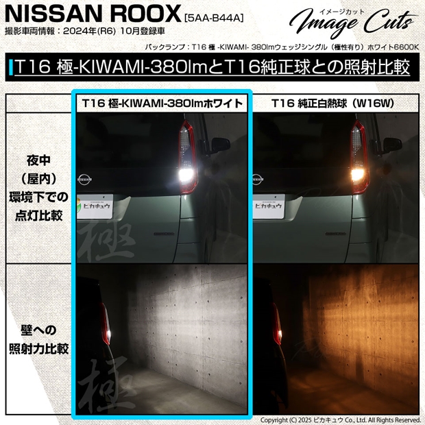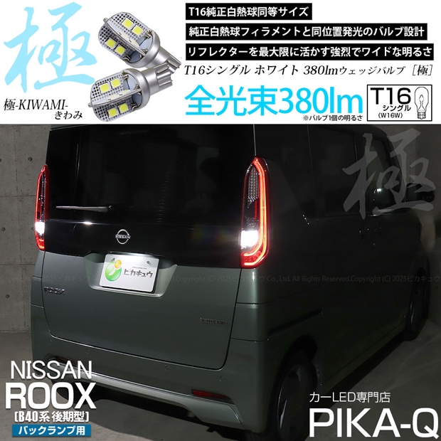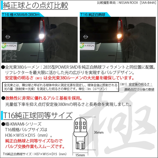 ピカキュウ,LED専門店,LEDバルブ,国産DC12V車,LED,SMD,T16シングル,W16W,バックランプ,ホワイト,全光束380lm,ハイブリッド車対応,極,KIWAMI,きわみ,ニッサン,日産,NISSAN,ルークス,ROOX,B44A,B45A,B47A,B48A
