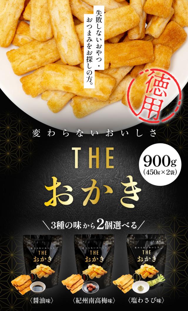 訳あり 3種から2個選べるTHEおかき 900g(450g×2袋) おかき 割れおかき メガ盛り 醤油味 紀州南高梅味 塩わさび味 送料無料 大容量 ワケ有 わけあり 訳アリ ワケアリ グルメ お菓子 おつまみ